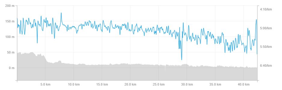 By now I was about 15 miles in to the race and still feeling ok. My pace had levelled out at just a few seconds over 5min/km which I felt good with. I had a hand held bottle with me for hydration and fuel, and I’d drained this already. I grabbed a couple of bottles at a water point and refilled as I ran. I was using Tailwind nutrition which I learned about from the fling. I’d used it on a few shorter runs recently since grabbing a bag of it when I was last in the US for work, and it seemed to work well for me. The challenges I had in the latter stages of the fling are something I want to overcome, and the marathon felt like a good place to give this stuff a decent road test. I have to say it worked well. Throughout the race I felt like I had a steady amount of energy and never once felt like I was starting to slump from lack of energy intake.